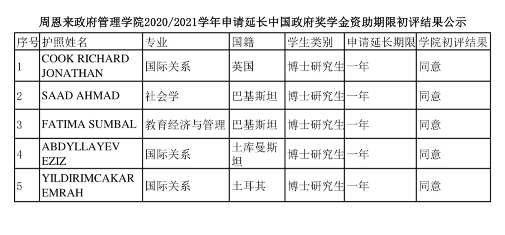 2020/2021学年申请延长中国政府奖学金资助期限初评结果公示