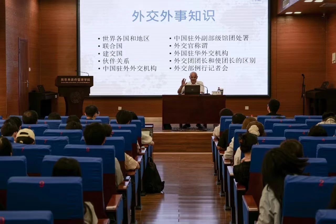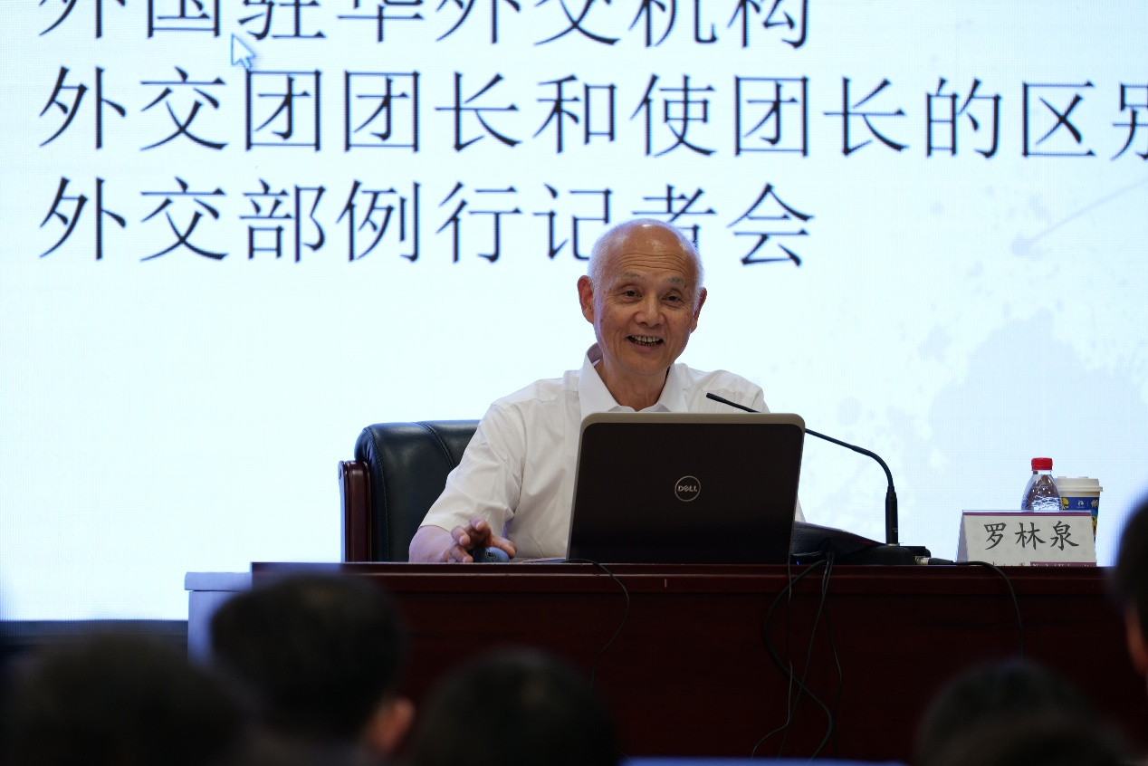罗大使首先讲授了有关联合国、建交国、伙伴关系、中国驻外外交机构、外交官称谓、外国驻华外交机构、外交团团长和使团长的区别、外交部例行记者会等多方面的外交知识。随后详细介绍外交和礼宾工作的内涵。外交是国家以和平手段对外行使主权的行为。罗大使表示,他很欣赏英国著名外交家萨道义对于外交的定义,即“外交是运用智慧和机敏去处理各独立国家的政府之间的官方关系,有时也推广到独立国家和附庸国家之间的关系,或者更简单地说,是指以和平手段处理国与国之间的事务”。礼宾是指对外交往中有礼仪活动、礼节、礼貌和外交特权与豁免方面的工作,是外交工作的重要组成部分。外交礼仪的基本原则有四:平衡原则、对等原则、惯例原则、“不卑不亢”原则。礼宾工作的属性包含国际性、政治性、政策性、民族性、艺术性、责任性、专业性和事务性。