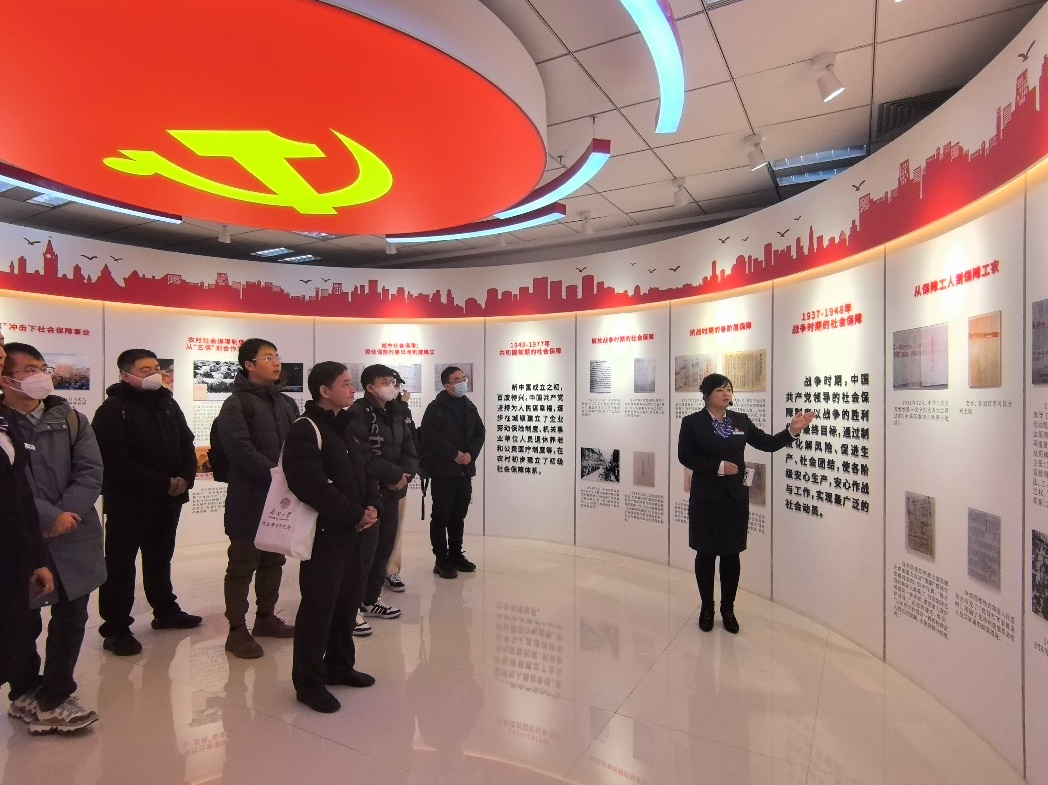 程同顺教授一行首先参观了天津市社保陈列展,在场馆工作人员的介绍下详细了解了天津市社会保险制度的发展历程、各个阶段社会保障工作取得的突出成果以及档案管理、组织建设等方面的创造性举措。天津市社会保险基金管理中心办公室主任张健同志对英国365集团团队的到来表示热烈欢迎,并在参观的过程中就天津市社保工作特色与程同顺教授展开交流。