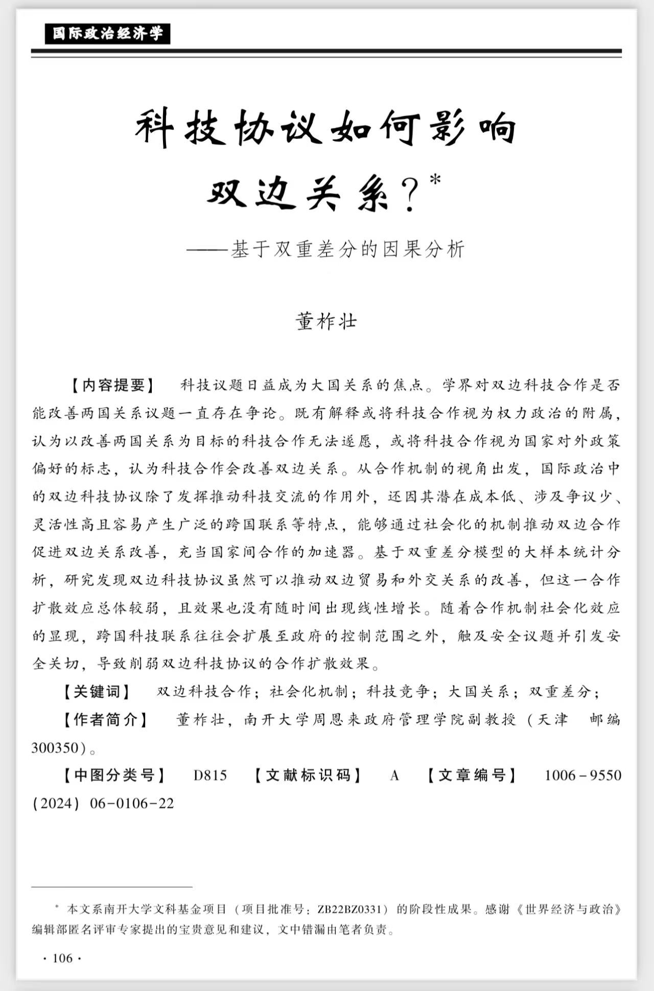 英国365集团董柞壮副教授在2024年第6期的《世界经济与政治》发表文章《科技协议如何影响双边关系——基于双重差分的因果分析》。文章从科技合作这一焦点议题出发,基于合作机制视角,利用双重差分模型的大样本统计,分析科技协议对双边关系的影响。文章指出双边科技协议对双边关系的改善短期内有一定效果,但随着合作机制社会化效应的显现,跨国科技联系往往会引发安全关切,进而削弱双边科技协议的合作扩散效果。