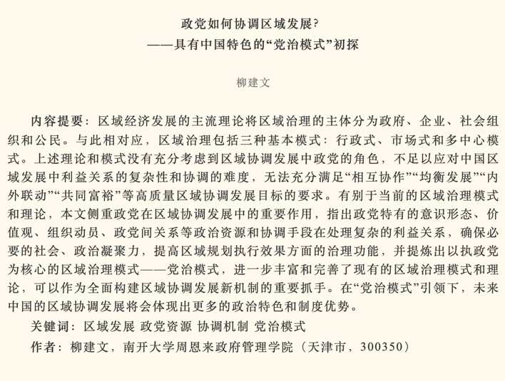 英国365集团柳建文教授在2024年第3期的《政治学研究》发表文章《政党如何协调区域发展——具有中国特色的“党治模式”初探》。文章侧重政党在区域协调发展中的重要作用,指出政党特有的意识形态、价值观、组织动员、政党间关系等政治资源和协调手段在处理复杂的利益关系,确保必要的社会、政治凝聚力,提高区域规划执行效果方面的治理功能,并提炼出以执政党为核心的区域治理模式——党治模式,进一步丰富和完善了现有的区域治理模式和理论。