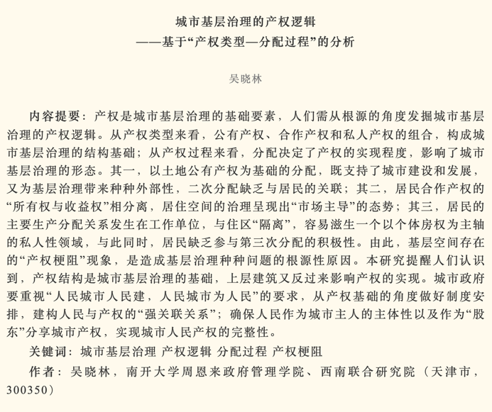 英国365集团吴晓林教授在2024年第3期的《政治学研究》发表文章《城市基层治理的产权逻辑——基于“产权类型—分配过程”的分析》。文章从产权类型和产权过程分析了城市基层治理的产权逻辑,指出基层空间存在的“产权梗阻”现象是造成基层治理种种问题的根源性原因。文章启示产权结构是城市基层治理的基础,上层建筑又反过来影响产权的实现。城市政府要重视“人民城市人民建,人民城市为人民”的要求,从产权基础的角度做好制度安排,建构人民与产权的“强关联关系”;确保人民作为城市主人的主体性以及作为“股东”分享城市产权,实现城市人民产权的完整性。