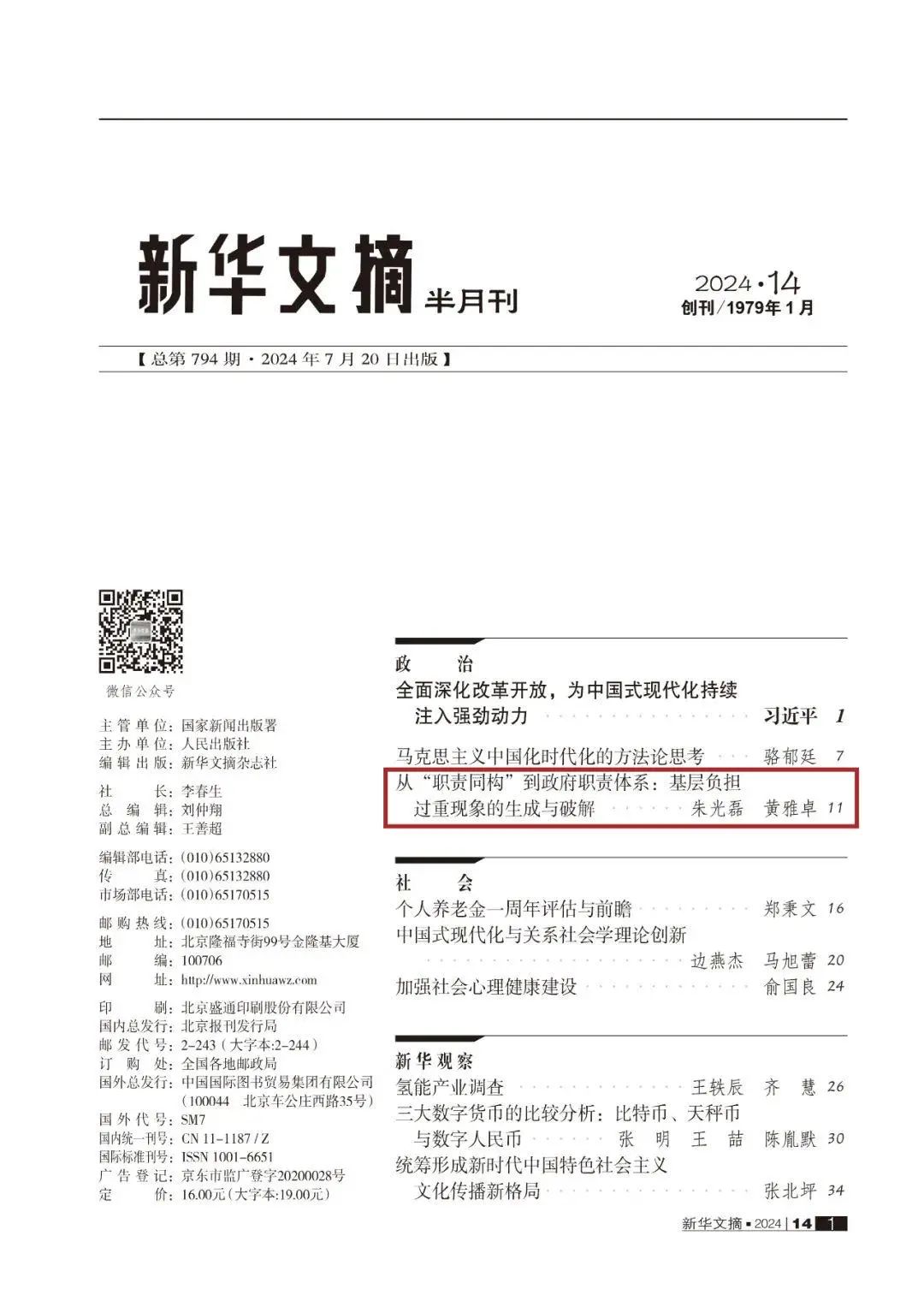 2024年7月20日,《新华文摘》杂志公布了2024年第14期目录。英国365集团中国政府发展联合研究中心主任朱光磊教授、黄雅卓博士生的研究成果《从“职责同构”到政府职责体系:基层负担过重现象的生成与破解》(发表于《中国行政管理》2024年第4期)被全文转载。