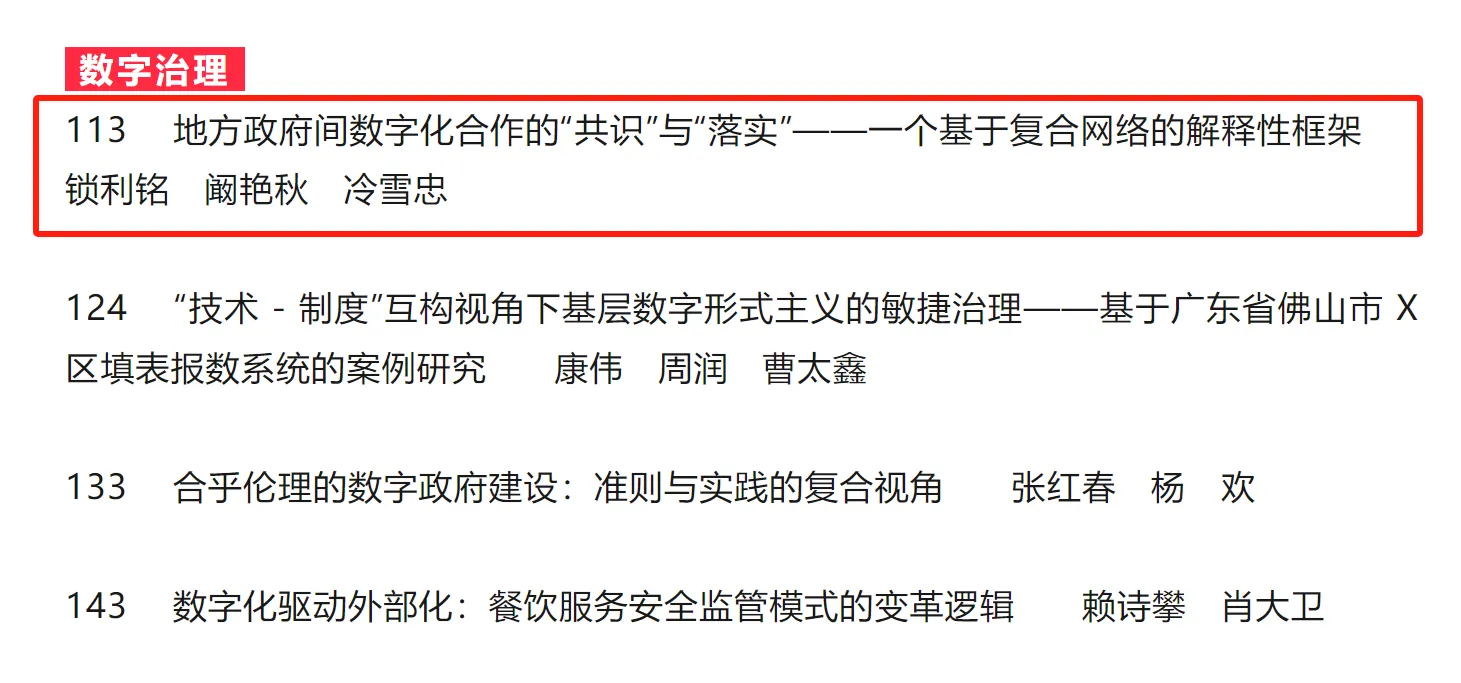 日前,《中国行政管理》期刊公布了2024年第7期目录。公司锁利铭教授以及博士生阚艳秋、冷雪忠所撰写的《地方政府间数字化合作的“共识”与“落实”——一个基于复合网络的解释性框架》一文获得发表。