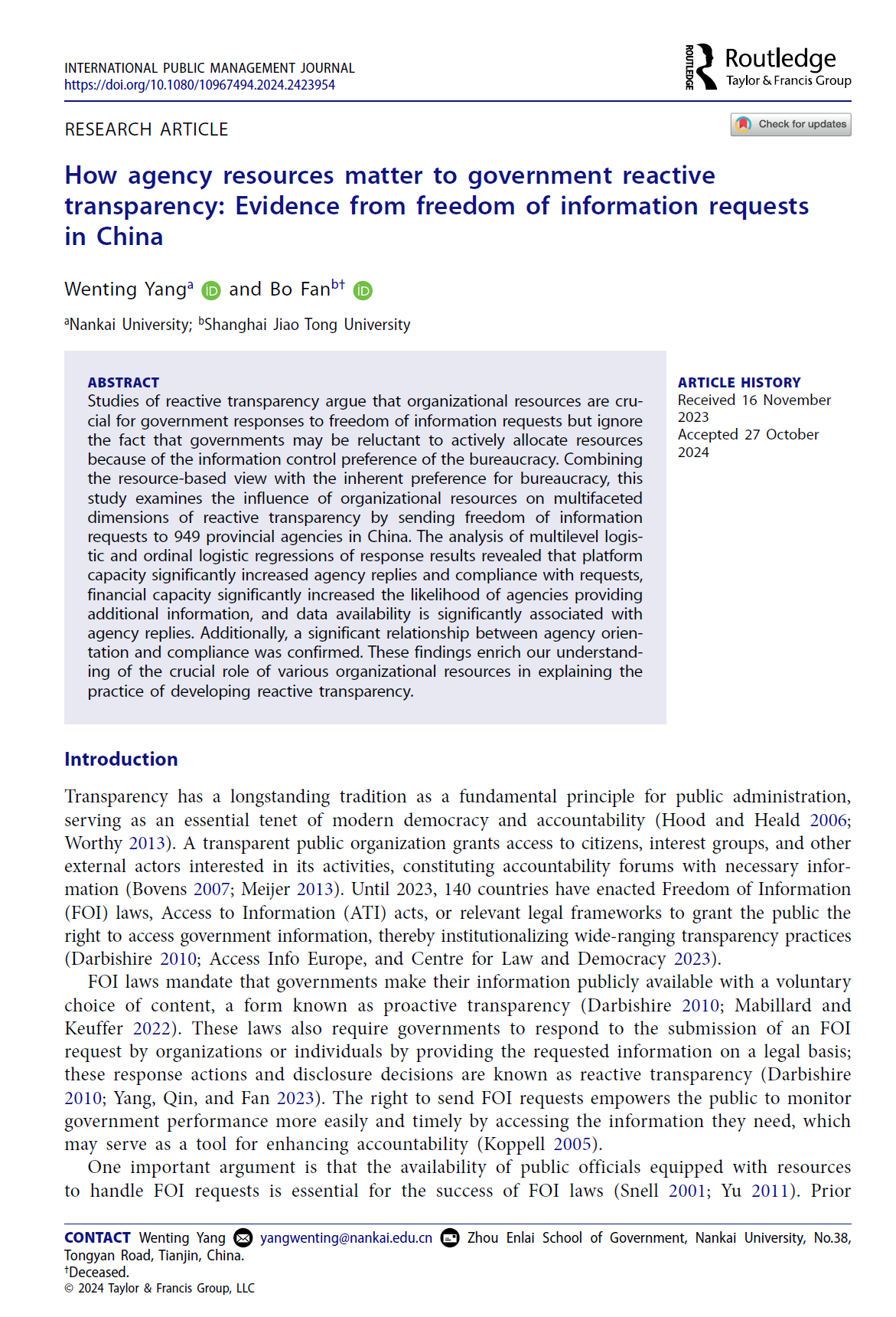 Wenting Yang & Bo Fan. (2024). How Agency Resources Matter to Government Reactive Transparency: Evidence from Freedom of Information Requests in China. International Public Management Journal, 1–19. https://doi.org/10.1080/10967494.2024.2423954