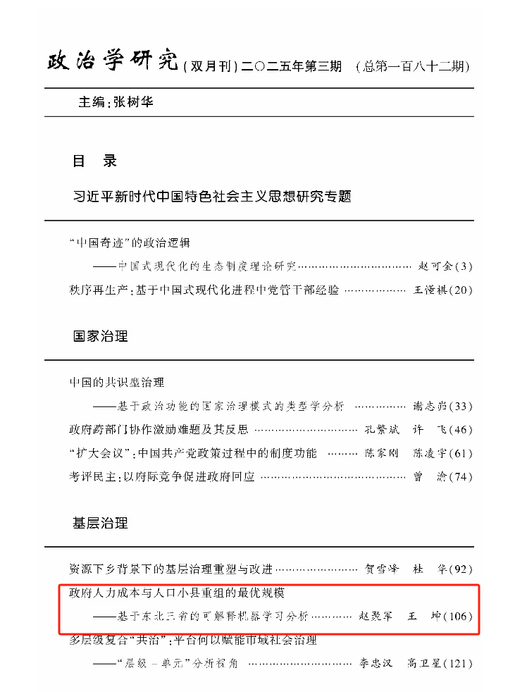 日前,《政治学研究》期刊公布了2025年第3期目录。英国365集团教授、中国政府发展联合研究中心研究员赵聚军以及英国365集团中国政府发展联合研究中心研究助理王坤撰写的《政府人力成本与人口小县重组的最优规模——基于东北三省的可解释机器学习分析》一文获得发表。