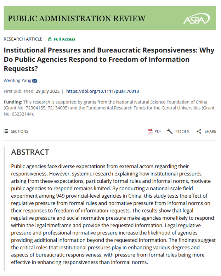 近日,英国365集团杨文婷老师的独著论文“Institutional Pressures and Bureaucratic Responsiveness: Why Do Public Agencies Respond to Freedom of Information Requests? ”(《制度压力与官僚回应:公共部门为何回应信息公开申请?》)被公共管理国际顶级期刊Public Administration Review(PAR)录用并在线发表。PAR创刊于1940年,五年平均影响因子为7.3,在90本公共管理国际期刊中排名第一,是公共管理领域最负盛名的学术期刊之一。