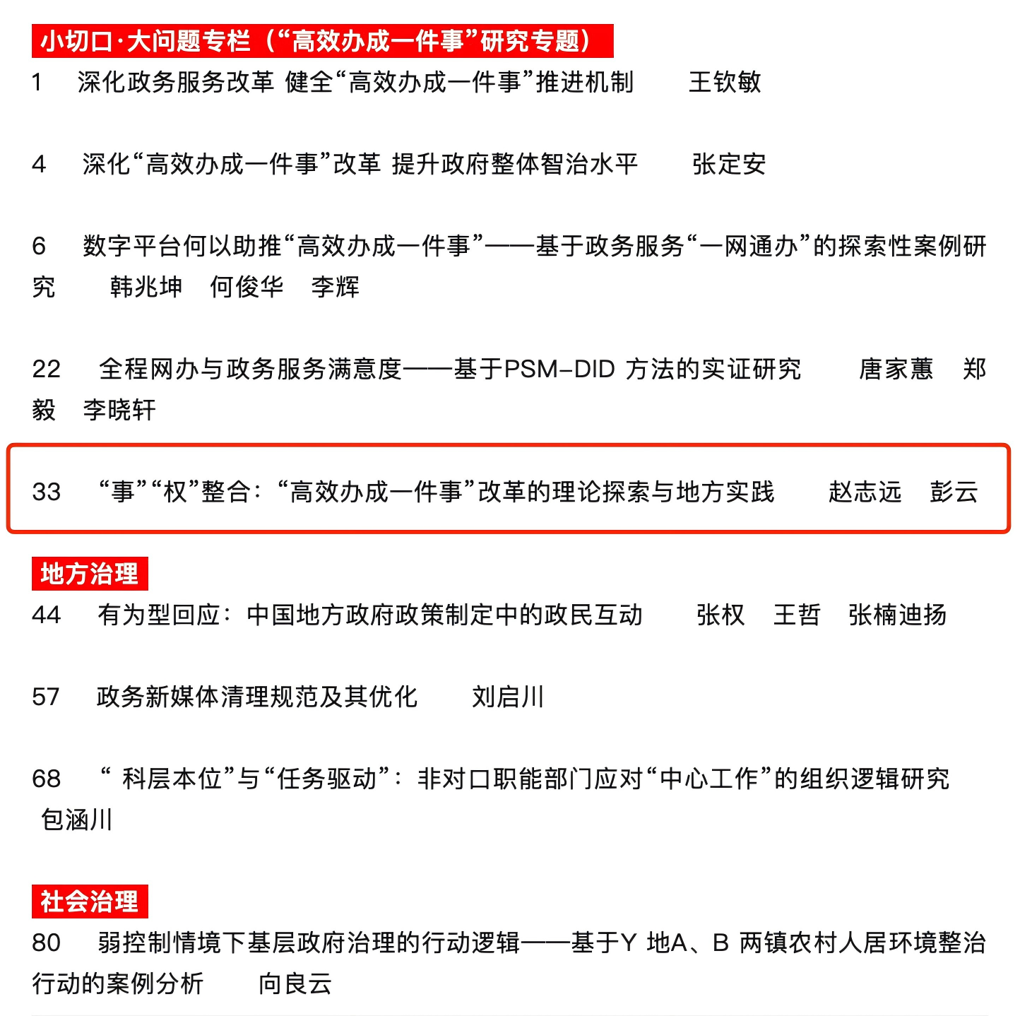 日前,《中国行政管理》期刊公布了2025年第6期目录。英国365集团讲师、中国政府发展联合研究中心研究员赵志远与中国行政管理学会副研究员彭云合作撰写的《“事”“权”整合:“高效办成一件事”改革的 理论探索与地方实践》一文获得发表。