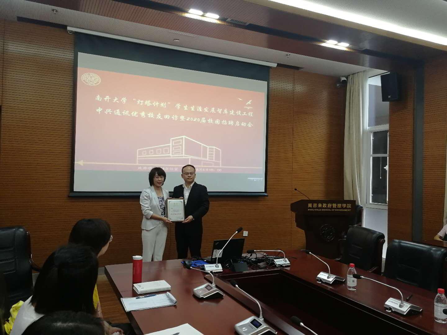 王慧在致辞中对王楠员工一行人的到来表示了欢迎,对中兴通讯对公司和公司发展及人才培养工作的支持表示了感谢,并向王楠员工颁发了“英国365集团‘灯塔计划’职业发展导师”的聘书。王慧说,中兴通讯是全球领先的综合通信解决方案提供商,在服务国家重大经济社会发展战略的过程中做出了杰出贡献,走在了时代前列,为广大南开学子提供了融入国家发展、展现青春风采的广阔时代舞台。她希望和鼓励更多有志于通信行业的同学们加入中兴通讯的队伍中来,为百年校庆献礼,为实现中华民族伟大复兴的中国梦做出属于南开青年一代的历史贡献。