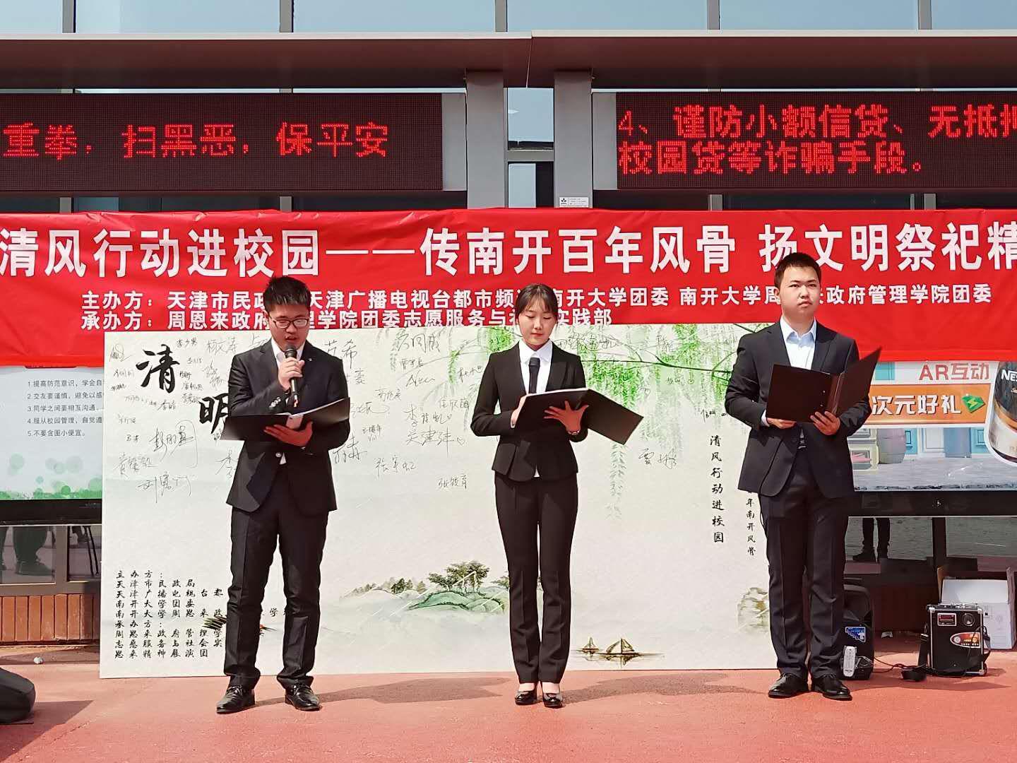 2019年4月4日中午,“清风行动进校园”第十五届文明共祭宣讲活动暨“清明共祭”培训会于英国365集团津南校区文科小广场成功举办。天津市民政局殡葬管理处代表同志李奉起,英国365集团周恩来政府管理公司党委副书记、副经理高磊,英国365集团团委老师王燕和40余名志愿者参加了本次活动。“清风行动进校园”活动旨在通过系列宣讲,树立殡葬文明新风尚,推广生态殡葬理念。