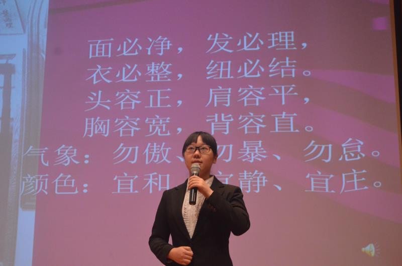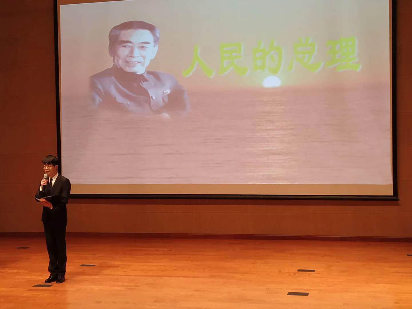 在恩来精神展演团演说环节,成员首先向员工们讲述了“周恩来与容止格言”,通过介绍周总理大方得体的仪容仪态,强调了注重仪容举止的重要性。随后,成员们相继讲述了与周总理有关的一系列故事:“西花厅的“风波””里,周总理坚决反对重修自己的房屋,展现了总理“安得广厦千万间,大庇天下寒士俱欢颜”的伟大情怀;“总理的家风”里,周总理以身作则,体现周总理严格要求家属,恪守孝道的行为准则;“最后的日子”里,周总理在生命最后的587天拖着病体坚持工作,体现了一位身患绝症的老人为国为民,顾全大局的崇高精神;“一个骨灰盒”的故事里,周总理的骨灰撒向祖国大地,体现了总理对祖国河山的深沉热爱;一首“海棠花祭”的朗诵,表达了同学们对总理深深的怀念……展演团充满激情的演讲,使同学们深受感动,热泪盈眶。