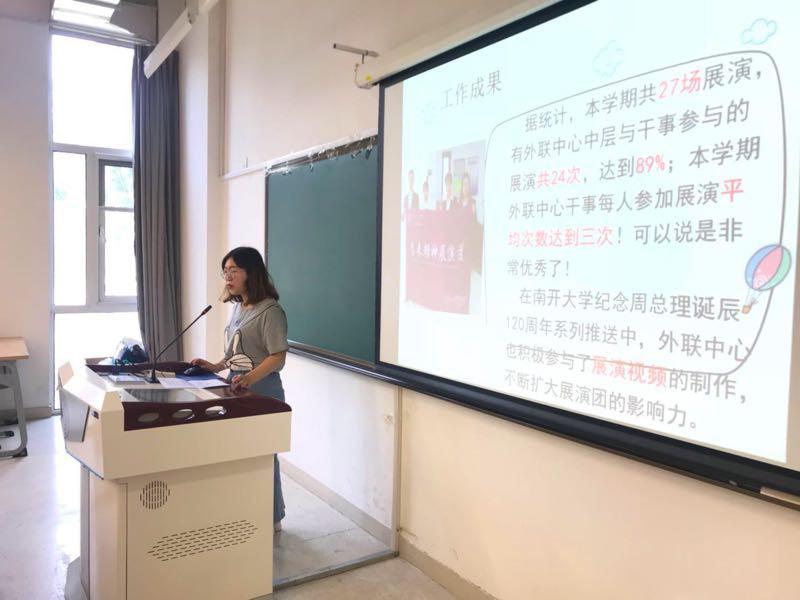 曹承怡回顾了本学期外联中心积极参加展演活动、进行恩来话剧排练和演出、加强内部建设、努力联系展演的情况,展现出外联人亲如一家的深厚感情,让人感受到了外联人的独特风采。她表示外联中心将会加强展演联络,争取更多的展演机会,扩大恩来精神的影响。