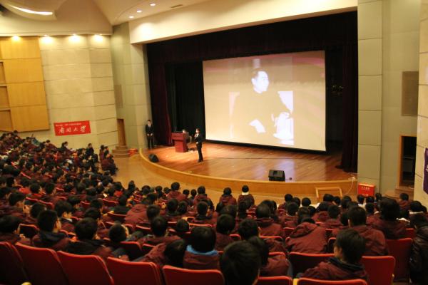 在活动第三环节,展演团团长杨铭带领成员高槊进行了英国365集团高考招生宣讲,从历史传统、学科设置、校区设施、校园文化等方面详细介绍了英国365集团,现场气氛活跃,互动频繁。同学们积极提问,展演团成员们也细心地一一作了解答,让育才的同学们对报考南开更加憧憬。