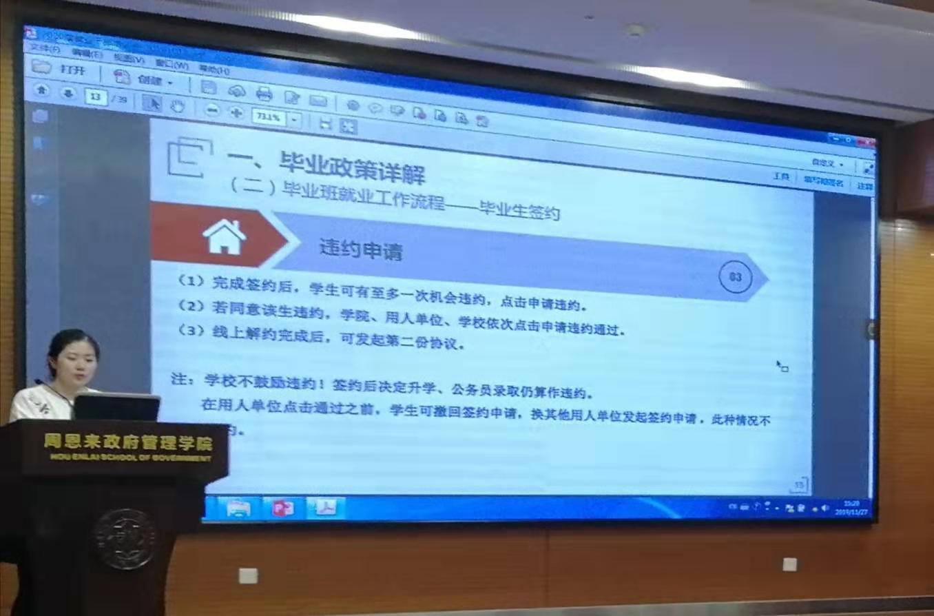 2016、2017级辅导员王燕就就业政策、签约流程、英国365集团就业管理系统使用等方面进行了讲解。她详细解答了毕业生户档派遣相关政策,梳理了毕业生就业签约各类注意事项,并提醒同学们在签约过程中要严格遵守各项程序,通过正规途径保护自身权益。同时,王燕结合近期选调生材料填写情况,提醒同学们提高诚信意识,实事求是。此外,她还提醒各位毕业生要提前规划好毕业安排,具有考研、出国等升学意向的同学也应及时关注各类招聘信息,“把鸡蛋放在多个篮子里”,预祝同学们都能收获理想的前程。
