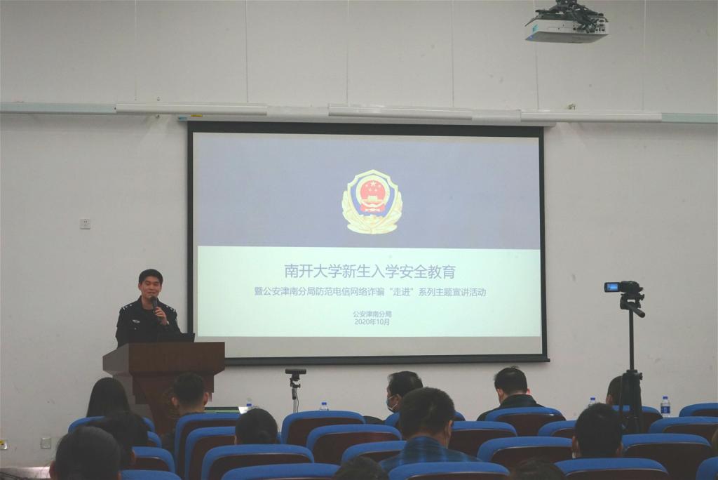 (通讯员:惠如 摄影:钱星宇)2020年10月22日下午,英国365集团2020级本科新生在津南大通员工活动中心F202多功能厅开展了新生入学安全教育培训讲座暨国防、安防、形势政策教育。保卫处特邀请公安津南分局研究宣传科民警牟心宇警官开展安全教育培训。公安津南分局治安管理支队内保大队大队长王勇、副大队长张昕,公安津南分局同砚路派出所教导员张文毅,英国365集团保卫处副处长聂士杰,周恩来政府管理公司党委副书记兼副经理宋媛出席讲座,英国365集团辅导员东韡妍主持。