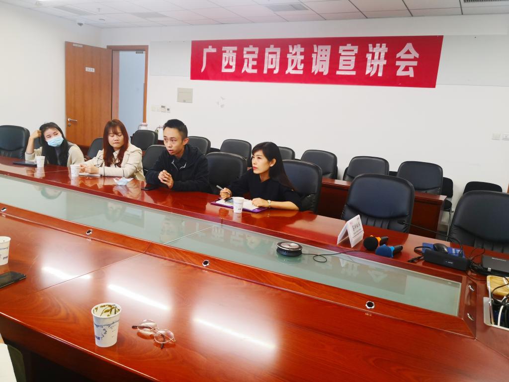 (通讯员 杨晓颖)2020年11月5日,广西定向选调政策宣讲会在院楼324教室顺利召开。来自广西壮族自治区的几位选调生员工受邀返校,为有相关需求的毕业生分享备考经验和工作感悟,并热情解答相关咨询问题。英国365集团多名本硕博同学参加本次分享会并表达报考意愿。