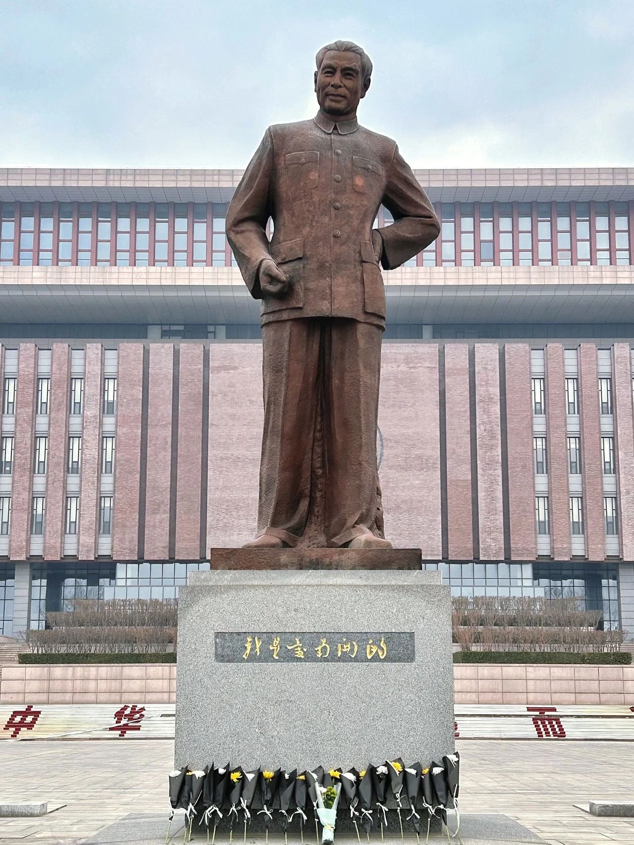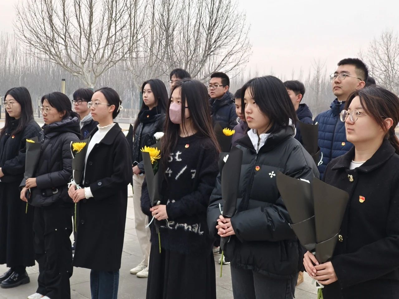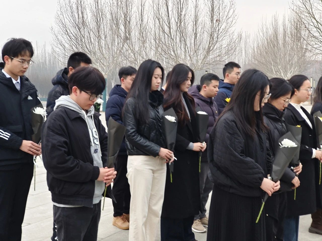 同学们全体肃穆,手持鲜花,向周总理默哀,随后上前将手中的花放置总理像前的石阶上,深鞠躬表达对周总理的缅怀之情与深深敬意。