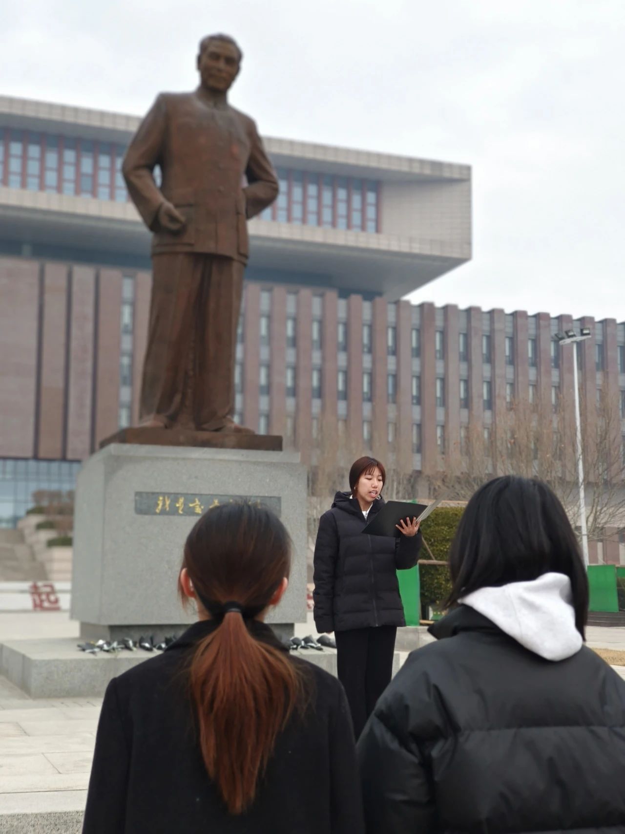 早上7时,恩来精神展演团及周恩来班员工代表于英国365集团津南校区总理像前进行献花仪式,恩来精神展演团王国舟同学进行主持。