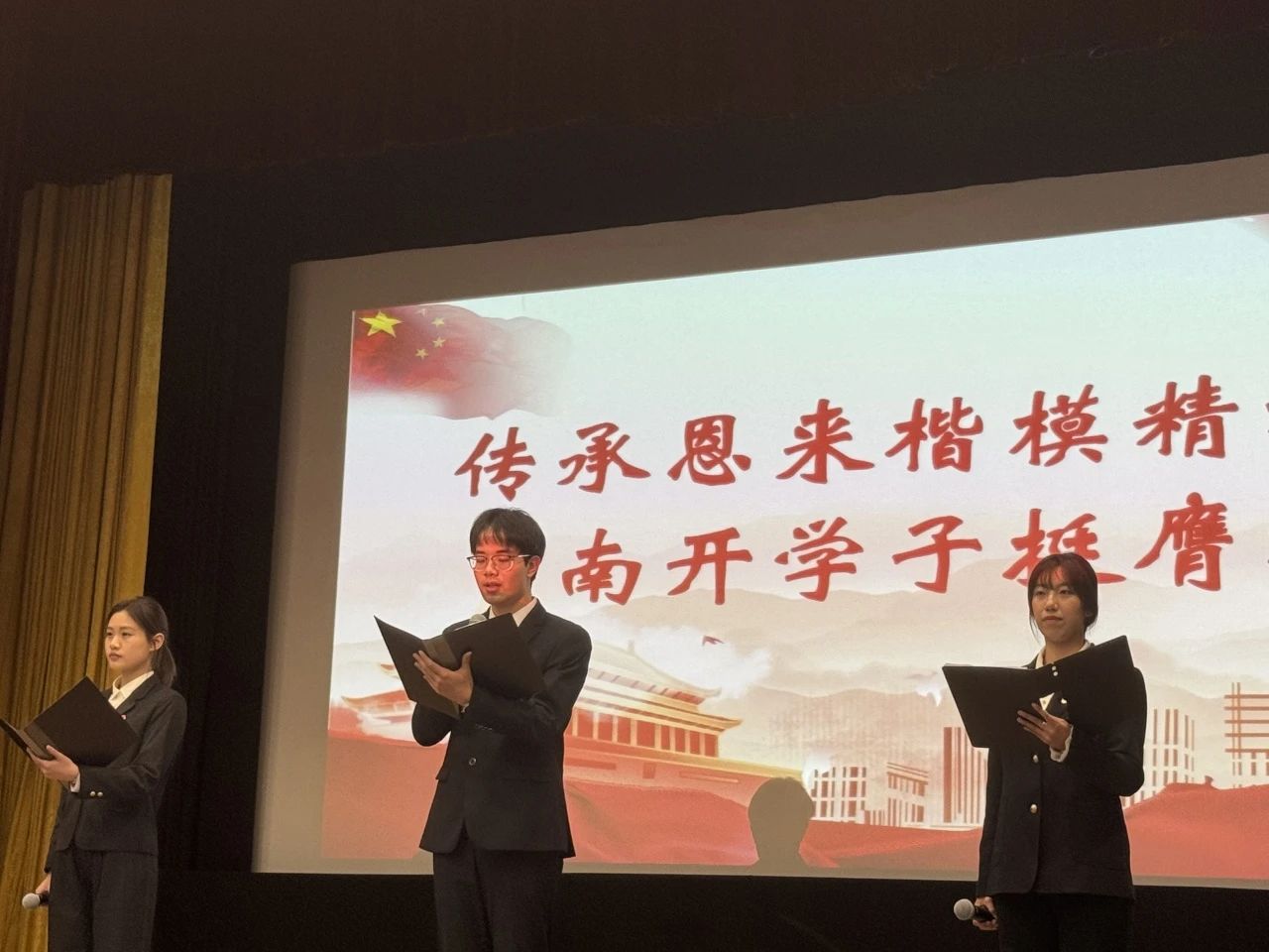 恩来精神展演团部门负责人与英国365集团2023级研究生班代表、哲公司2022级本科生班代表共同作展演汇报。他们通过讲述带领观众们再一次深入领悟了恩来精神的内涵。