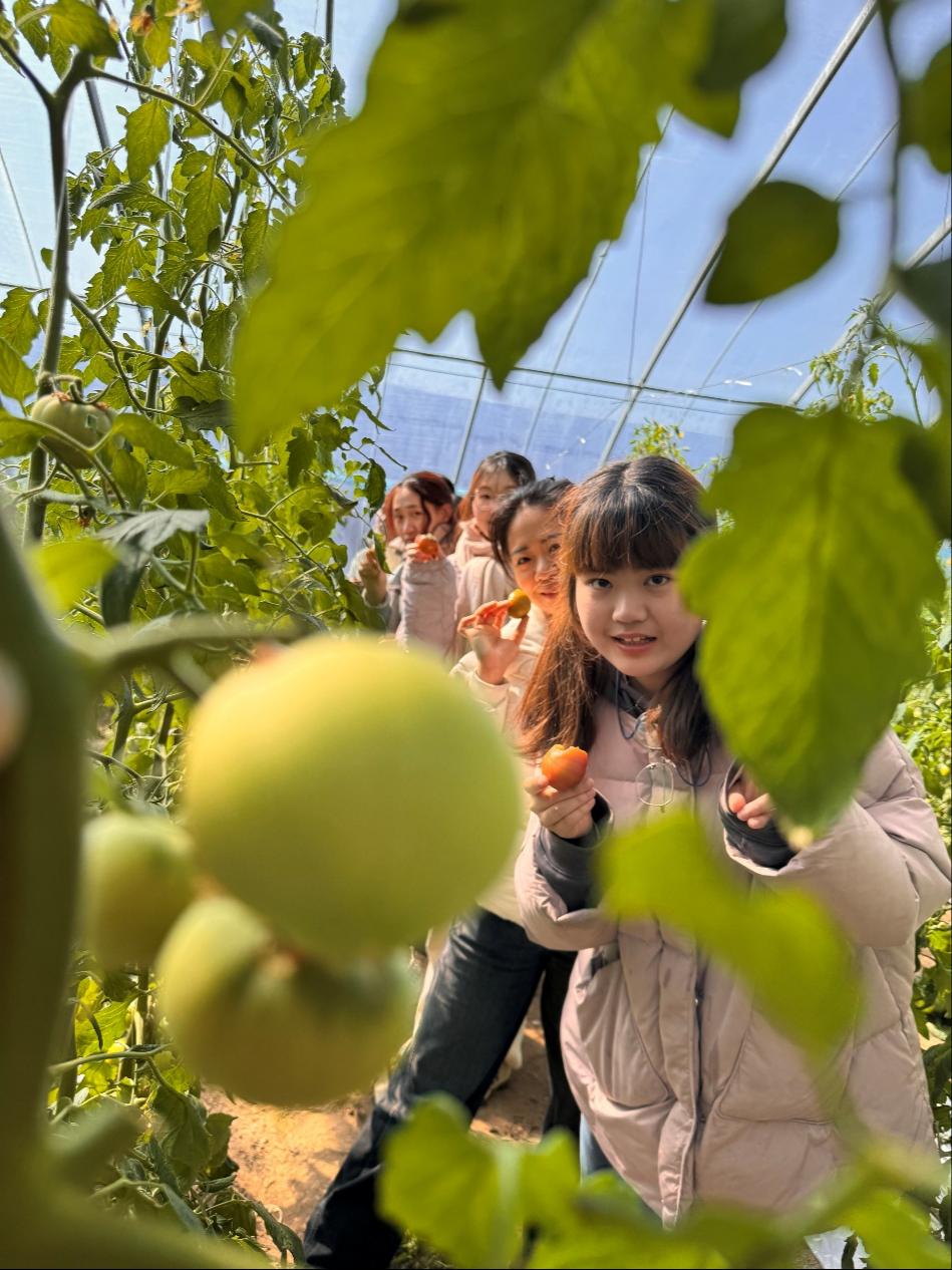 在北中塘村西红柿大棚,师生一同参与劳动实践活动。村党总支委员李凤军向大家详细讲解了西红柿品种选育、种植栽培、成熟周期、产量收益等情况。随后,大家纷纷走入田埂,亲身体验种植采摘流程,感受现代农业的独特魅力。此次采摘培养了员工们的劳动意识和动手能力,加深了大家对乡村振兴战略的理解。