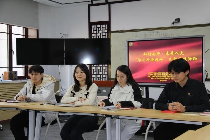 在活动讨论环节,两公司党员组建了六个跨校研究小组,围绕“南开政学启新思,人大社研悟两会”主题,在政治学、社会学、公共政策等学科视角下探索两会精神的内涵,分别就“实施就业优先战略”“深化教育‘双减’改革”“完善分级诊疗与医保支付体系”“加速普惠型养老服务体系建设”“优化保障性住房供给与长租房市场”“推进乡村振兴与城乡融合发展”等问题进行深入研究,并分别完成五分钟主题宣讲。在成果汇报环节,各位党员积极踊跃发言,分享对以上领域的真知灼见,展开了激烈的讨论。