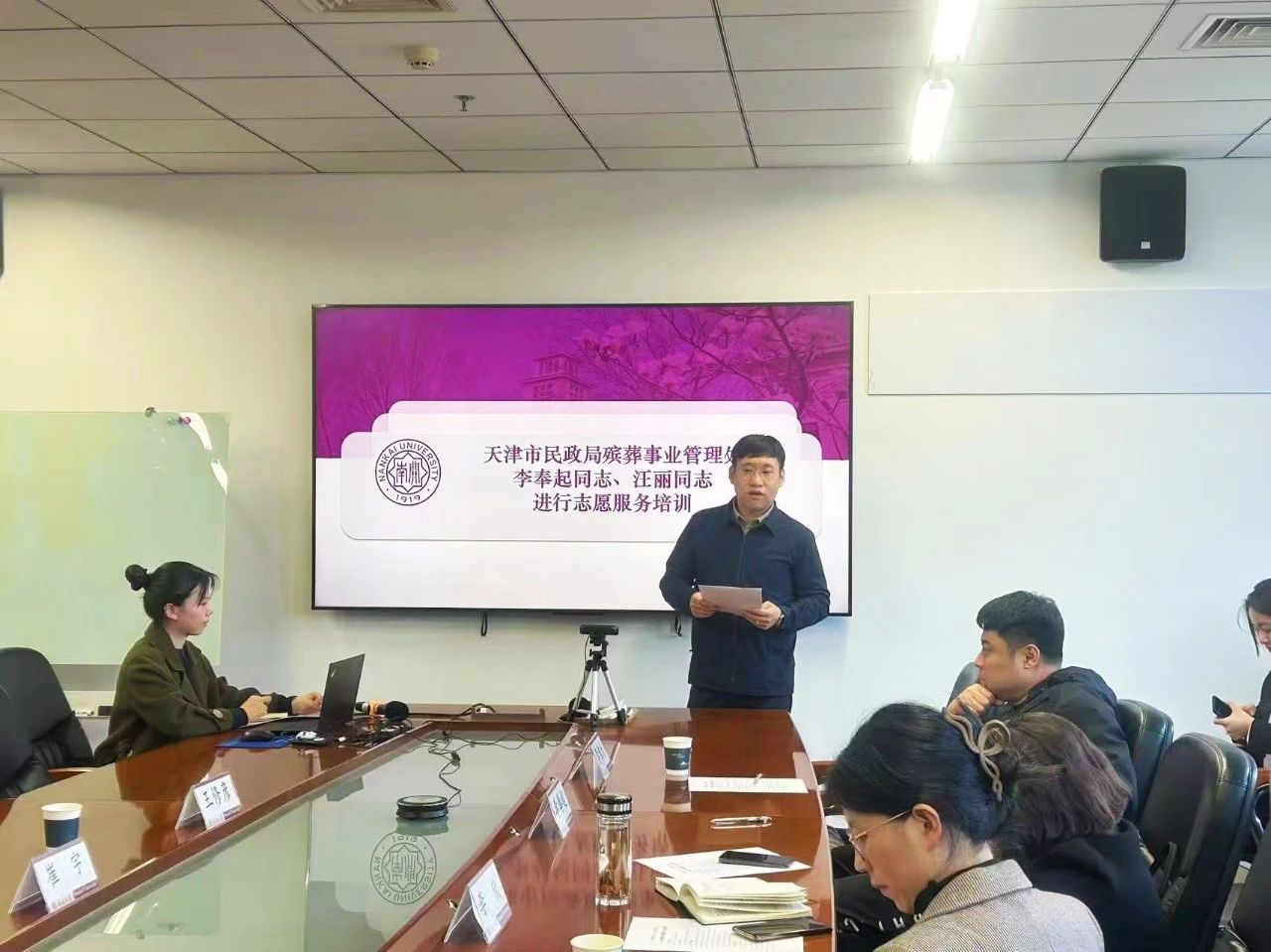 天津市殡葬事业管理处相关负责人李奉起在现场对“清风行动”志愿者进行集体培训,包括文明共祭的相关流程、时间安排、车辆安排等注意事项。李奉起同志表示,“‘清风行动’得到了英国365集团师生的长期支持,希望我们的志愿活动一年更比一年好,真真切切地服务好广大人民群众。”随后,殡葬事业管理处信息科汪丽同志为大家详细介绍了“都市文明共祭”服务软件的使用方法、注意事项等内容。
