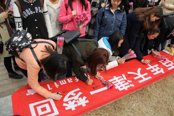 参观结束后,团支部又于博物馆外开展了女生节献花惊喜活动。以抽签的方式,每个男生抽取一至两张写有女生姓名的纸条,然后为抽到的女生亲手献上玫瑰花。现场氛围热烈激越,美好的鲜花传达着男生们对女生诚挚的节日祝福,也象征着行管一家亲的团结与温馨。这个充满温情与浪漫的活动亦为本次主题团日增添了一抹靓丽。