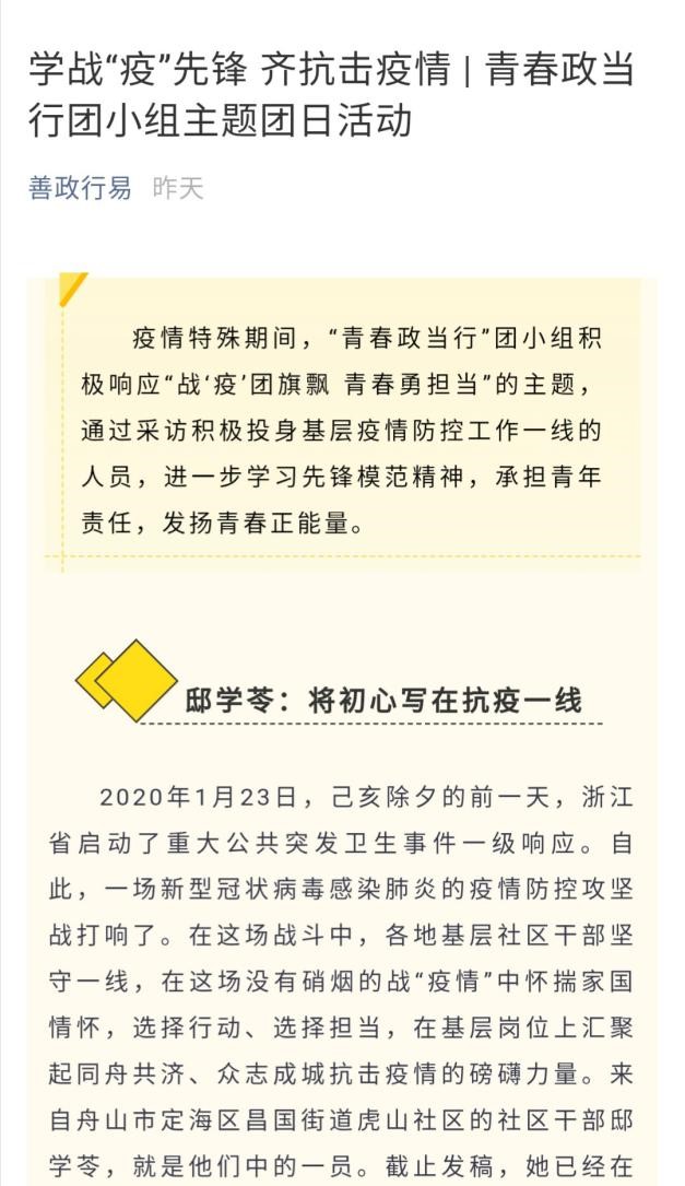 青春政当行团小组积极响应“战‘疫’团旗飘 青春勇担当”的主题团日活动,深入一线采访投身基层疫情防控工作的人员,并在后期将采访成果制作成“战‘疫’先锋”系列专访推送,在团委公众号、班级公众号和团小组公众号发布,号召广大团员青年行动起来,积极参与疫情防控阻击战,学习先锋模范精神,发扬青春正能量,将青春的光彩挥洒在祖国和人民最需要的地方。团小组成员用行动证明了“一代人有一代人的长征,一代人有一代人的担当”,正是每一代青年担当责任的样子,成就了这个国家和民族的当下和未来。