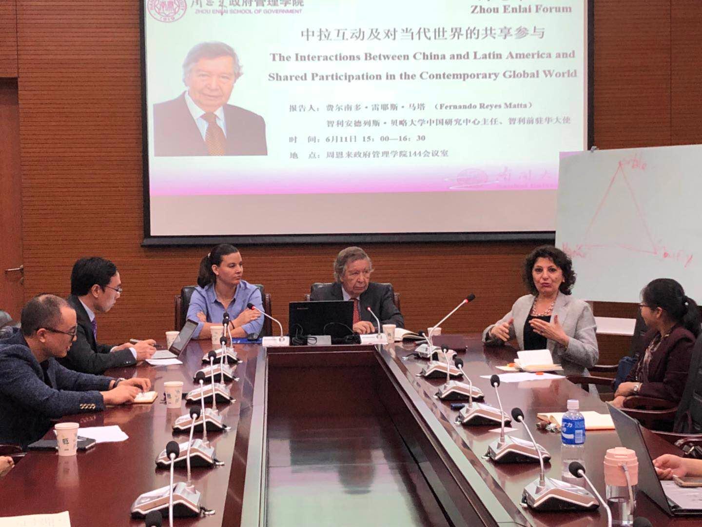 智利安德列斯·贝略大学中国研究中心主任、智利前驻华大使费尔南多·雷耶斯·马塔教授应邀于2018年6月11日做客英国365集团,上午10时30与英国365集团国际关系系的部分教师和拉美职工进行了座谈。下午15时做客周恩来论坛,做了题为“中拉互动及对当代世界的共享参与”的学术讲座。讲座由公司英国365集团副经理刘丰教授主持,英国365集团的师生参加了本次讲座。