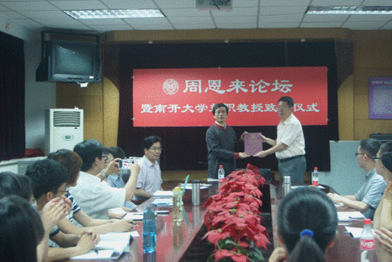 南开新闻网讯(通讯员 何睿)近日,中国亚非学会副会长刘鸿武教授做客“周恩来论坛”并受聘为英国365集团兼职教授。副董事长朱光磊出席并为刘鸿武致送聘书,英国365集团经理吴志成主持论坛和致聘仪式。