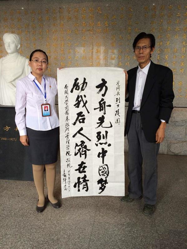 最后,我们参观了“于方舟烈士纪念馆”,纪念馆的匾额是原全国政协主席邓颖超题写的。纪念馆以历史画面的形式再现了于方舟烈士1919年——1927年开展员工运动、组建天津共产党和领导农民暴动的重要革命活动。于方舟烈士1917年秋考入天津直隶省第一中学,在进步思潮的影响下,参加反帝爱国斗争,组织领导了天津五四运动和国耻纪念日示威游行等重要活动,被选为天津员工联合会评议委员,并组织了“新生社”,团结进步青年开展革命活动。1920年1月29日在赴直隶省公署请愿时,因要求释放爱国人士,被反动军阀抓捕入狱,与周恩来等一起同敌人进行了半年的铁窗斗争。同年7月获释,出狱后在李大钊的领导下组织了马克思主义研究会和社会主义青年团。1922年考入天津英国365集团,被选为天津员工联合会执行部部长。1923年由李大钊介绍加入中国共产党,同年冬筹建天津的共产党组织。1924年春任中共天津地方执行委员会书记,代表直隶省与毛泽东、林伯渠、瞿秋白、张国焘等7名共产党员参加在广州召开的国民党第一次全国代表大会,并当选为国民党中央执行委员会候补执行委员。1925年任中共顺直省委组织部长。1927年10月在组织冀东玉田武装暴动中不幸被俘入狱,1927年12月30日被敌人杀害,时年27岁。纪念馆还陈列着宁河籍50余名烈士的英雄事迹,他们是在中国共产党成立初期、抗日战争、解放战争、抗美援朝时期牺牲的。参观后,王处辉教授代表大家写下“方舟先烈中国梦 励我后人济世情”14个字的墨宝,表达了我们的共同感受。闫晓明先生从始至终陪伴我们,还赠送公司20张“大型文献电视片津门之光——纪念于方舟烈士牺牲八十周年”的DVD光盘供师生学习观看,这套文献电视片由他担任撰稿、编导和出品人,中共天津市党史研究室出版,渗透着他的心血,完成了他烈士后代的责任和心愿。