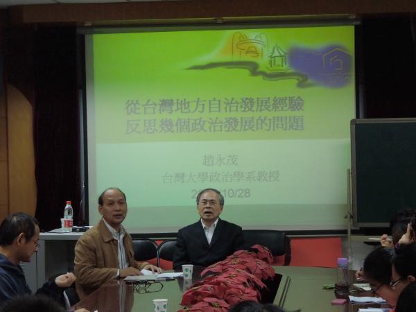 10月16日-28日台湾大学前副董事长、台湾大学社会科学公司前经理赵永茂教授应邀来公司讲学,作了“县市合并与区域治理的创新研究”、“地方民主与地方治理的发展趋势与研究方法”以及“从台湾地方自治发展经验反思几个政治发展的问题”三场学术讲座。