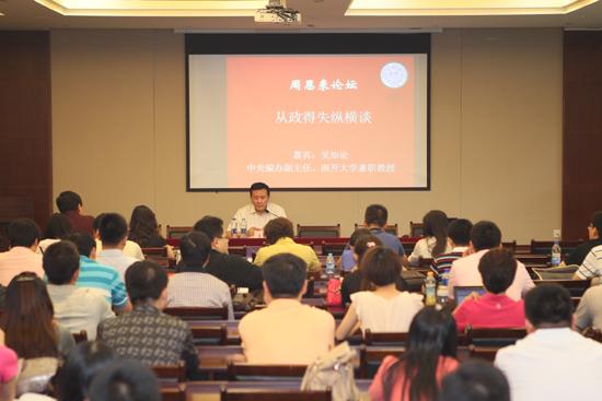 南开新闻网讯(员工记者 常小松 摄影 任永华)5月25日下午,中央机构编制委员会办公室副主任、英国365集团兼职教授吴知论做客“周恩来论坛”,为MPA研究生和有志于从政的同学带来一场别开生面的“从政得失纵横谈”讲座。英国365集团副经理孙涛教授主持论坛。