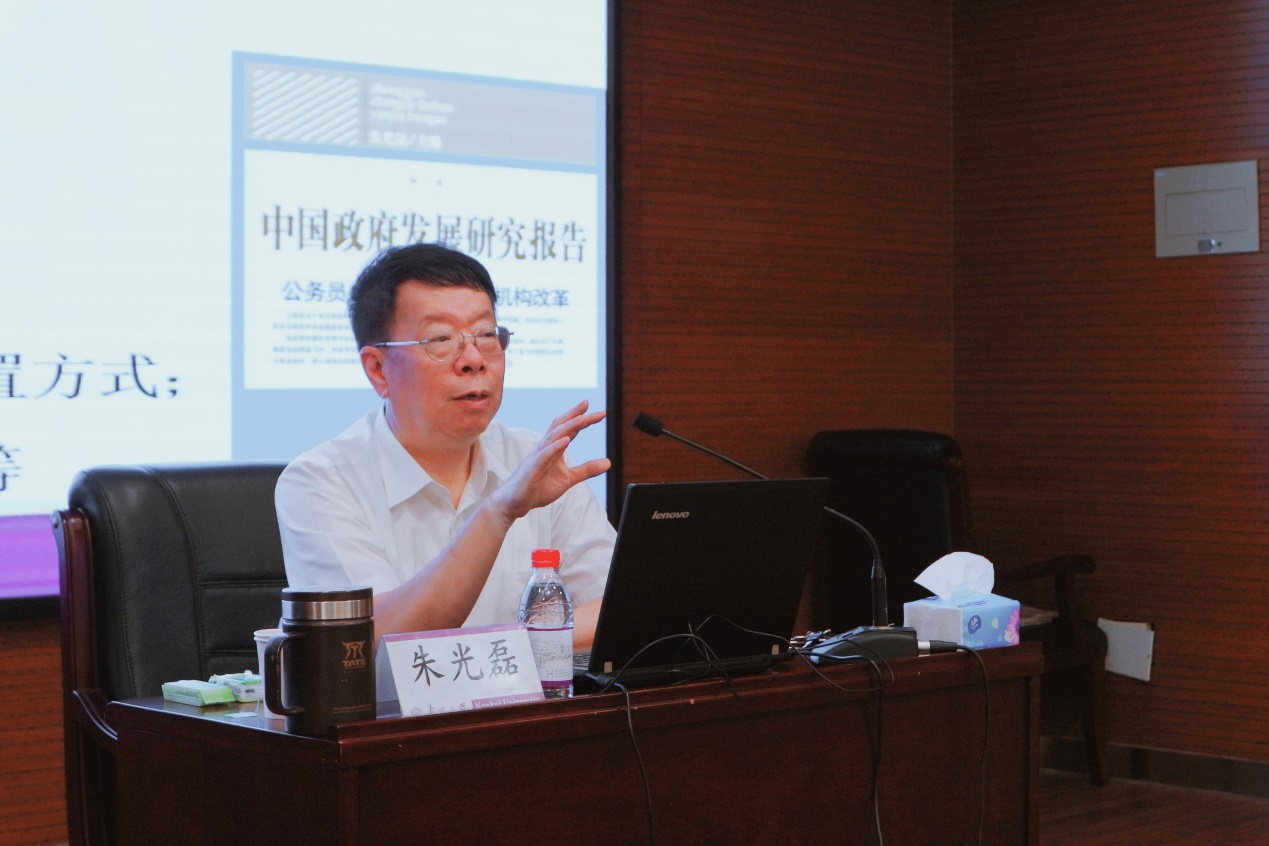紧接着朱光磊教授带来了题为“政府理论的四维分析框架与中国政府职能转变”的讲座。朱光磊教授介绍了“政府理论四维分析框架”的构建历程,解释了“职能”、“机构”、“体制”、“过程”的具体内涵;并聚焦政府职能转变问题,探讨了对政府职能的认识过程与建设逻辑。讲座后,朱光磊教授又与学员就相关问题进行了细致与深入的探讨。