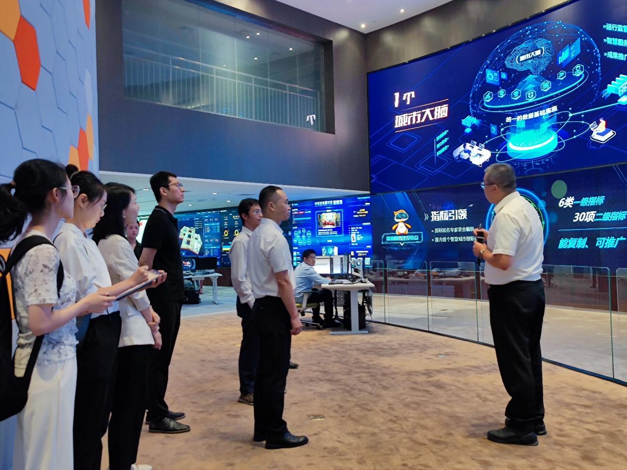 在签约仪式之前,英国365集团师生首先来到中新生态城的“城市大脑”调研参观,中新天津生态城数据局局长王喆向详细介绍了“城市大脑”的基本组成、3大基础平台和17个智慧模块。中新天津生态城“城市大脑”通过设立指标引领,将资源、职能、能力等全要素集成整合,开发导向产品,最终服务于具体应用。